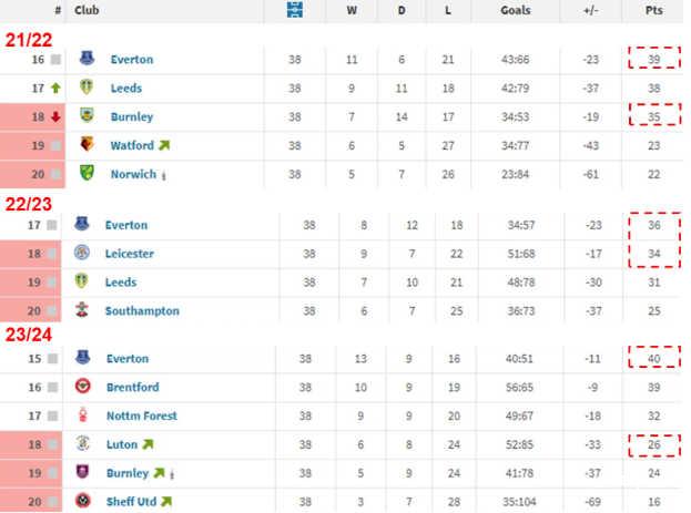 例如21/22赛季埃弗顿排名第16,领先第18的伯恩利4分,当时伯恩利曾向英超投诉太妃糖的潜在违规行为,希望能改变降级的命运,无果。等到23/24赛季判罚尘埃落定,“伯恩兄弟”已经在英冠走完轮回了,马上都要再次降级了,这显然是一种明显的不公平。